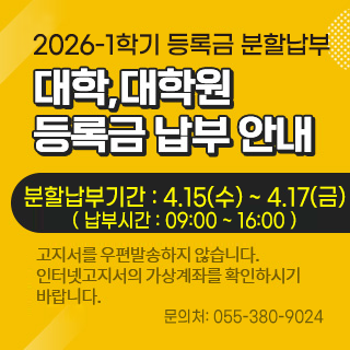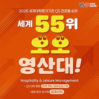 재학생 대학생활에 필요한 정보들을 제공합니다. 예비신입생 예비신입생에게 와이즈유를 소개합니다. 교직원&동문 와이즈유의 다양한 소식들을 전달합니다. WHO?자랑스런 와이즈유 OPEN CAMPUS오픈캠퍼스 YES21교직원 그룹웨어 WISEU TIMES와이즈유 타임즈 재학생 Mypage 학사정보시스템 YCMP(취업·비교과) 학사일정 등록금납부 수업 학적 학사서식 증명서발급 졸업인증제 e-class 교수학습개발원 도서관 스쿨버스 학생생활관 (기숙사) 교내식당 주간메뉴 국제교류 학생활동 풋살경기장 잔디운동장 창의설계실 생활정보 캠퍼스맵 양성평등상담실 장학 학습지원 메타버스 예비신입생 입학안내 대학소개 학과소개 언론홍보 내인생의스승 자랑스런 와이즈유인 오시는길 학생생활관 (기숙사) e-class 지원자조회 수강신청 교과목보기 메타버스 교직원&동문 YES21 교직원정보시스템 공지사항 학사일정 e-class 도서관 교수학습개발원 대학이미지(UI) 전화번호검색 캠퍼스맵(강의실검색) 증명서발급 메타버스 닫기 1 / 정지 재생 지금 와이즈유? 보도자료 IPP사업단, ‘일학습병행 외부평가’ 10명 합격 2026-03-18 보도자료 부산RISE사업단, AWS와 손잡고 AI영상제작 인재 양성 2026-03-17 보도자료 K-푸드 최영호 교수, 원동매화축제서 미나리 요리 시연 2026-03-16 보도자료 제4회 대학혁신포럼...AI 기반 미래교육 청사진 제시 2026-03-13 보도자료 한국어교육센터, ‘한국어 교원 3급 양성과정’ 운영기관 선정 2026-03-12 보도자료 사회복지학과 졸업생, ‘아마존웹서비스 해커톤’ 우수상 2026-03-11 보도자료 [포토] 신임 보직교원 임명장 수여식 2026-03-11 보도자료 “신입생의 설렘과 재학생의 꿈을 응원해!” 2026-03-10 이달의 와이즈유 03.03 1학기 최종 수강신청 정정 및 철회기간 03.03 1학기 개강 04.06 1학기 중간 강의평가 기간 04.06 수업일수 1/3선(자퇴자 등록금 5/6 환불 마감일) -일반휴학자 등록금 대치 마감일 04.07 1학기 중간고사 시간표 공고 04.13 하계 계절학기 개설희망교과목 신청기간 04.21 1학기 중간고사 기간 05.01 수업일수 60일(자퇴자 및 일반휴학자 등록금 2/3 환불 마감일) 정지 재생 학사일정 더보기 와이즈유 공지사항 와이즈유 새소식 전체 전체 더보기 학사 학사 더보기 장학 장학 더보기 등록 등록 더보기 취업 취업 더보기 일반 일반 더보기 사회봉사 사회봉사 더보기 바로가기 학사정보시스템 교내식당 스쿨버스 YCMP e-class 증명서발급 수업 학사Q/A 도서관 다양한 소식을 SNS을 통해 알립니다. 영산대학교 페이스북 바로가기 영산대학교 유튜브 바로가기 영산대학교 카카오채널 바로가기 영산대학교 블로그 바로가기 영산대학교 인스타그램 바로가기 영산대 “영심비 와이즈유 페스티벌” 와이즈유 영산대학교 K-MOVE 2개 운영 사업 선정 와이즈유 영산대학교 조리예술학과 김수현 학생, 산업인력공단 이사장상 수상 와이즈유 영산대학교 조리예술학과 김수현 학생, 산업인력공단 이사장상 수상 정지 재생 MICE특성화 해운대캠퍼스Haeundae Campus 관광문화예술대학 호텔관광학과 항공관광학과 관광컨벤션학과 레저스포츠관광학과 조리예술학부 K-Food조리전공 동양조리전공 서양조리전공 Bakery&Beverage전공 글로벌조리전공 미용예술학과 디자인학부 패션디자인전공 인테리어·도예디자인전공 연기공연미디어학부 연기공연예술전공 방송사진미디어전공 K-Pop전공 웹툰학과 게임VR학과 만화애니메이션학과 AI그래픽학과 시니어모델학과 웰니스보건대학 물류경영학과 글로벌학부 한ㆍ베트남통역전공 K-비즈니스전공 비즈니스법전공 미래융합대학 부동산학과 사회복지학과 헬스케어학과 아동·가족상담학과 미용건강관리학과 웰빙조리창업학과 실버재활학과 웰니스특성화 양산캠퍼스Yangsan Campus 웰니스보건대학 간호학과 물리치료학과 치위생학과 태권도학과 동양무예학과 경찰행정학과 융합전공학부 동양상담복지학과 한국어문화교육학과 기계ㆍ자동차공학과 수소시스템공학과 전기전자공학과 건축공학과 컴퓨터공학과 드론공간정보공학과 미래융합대학 인문문화융합학과 노인복지상담학과 성심교양대학 자기설계전공학부